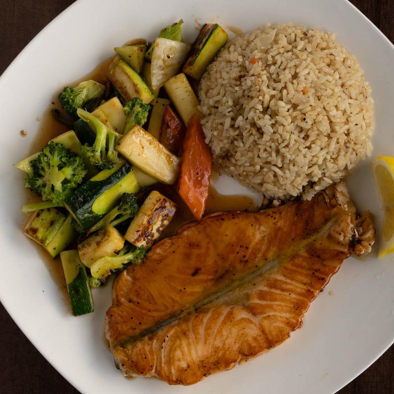 Salmon avocado, cucumber inside, spicy salmon & crunch outside, eel sauce & spicy sauce.